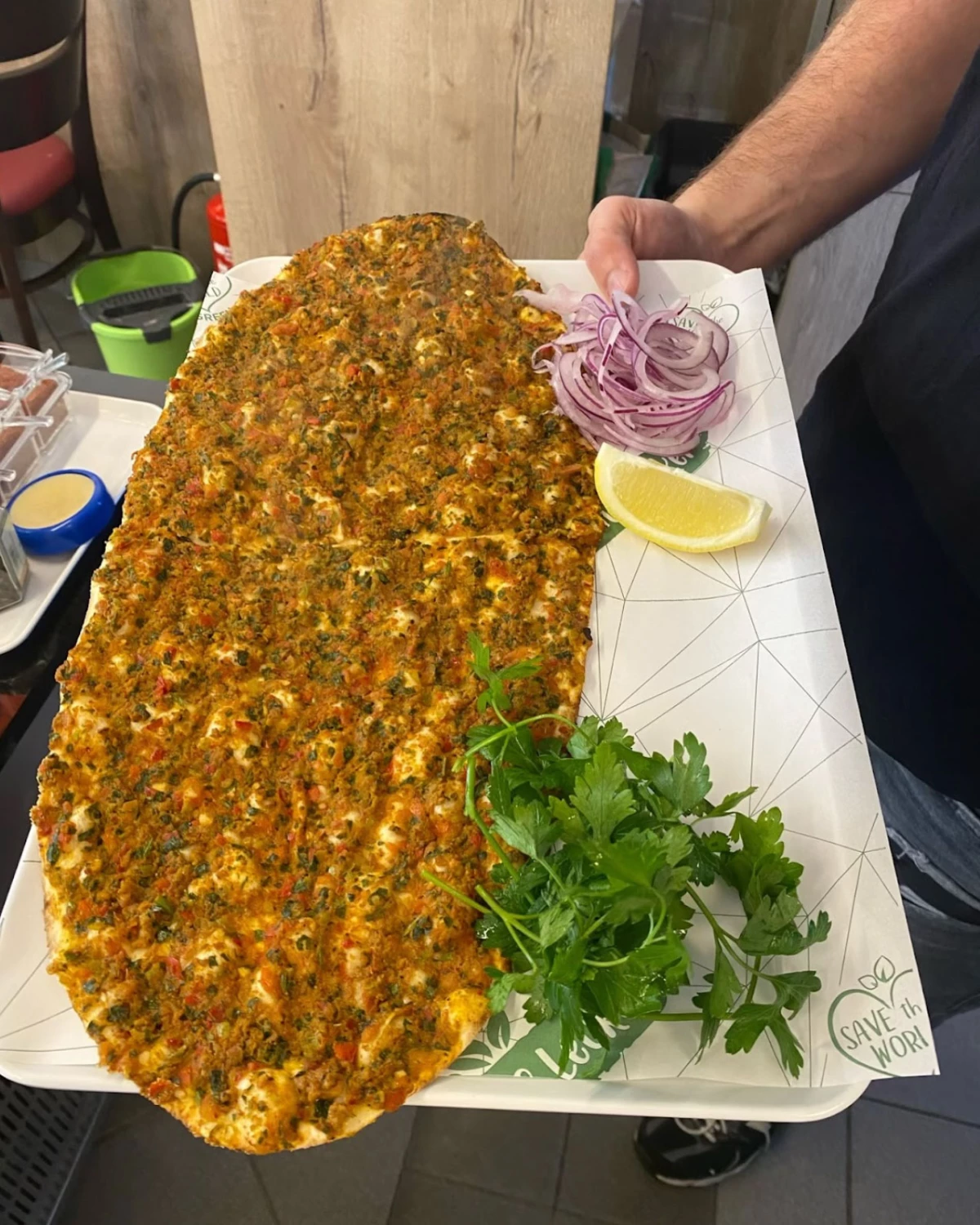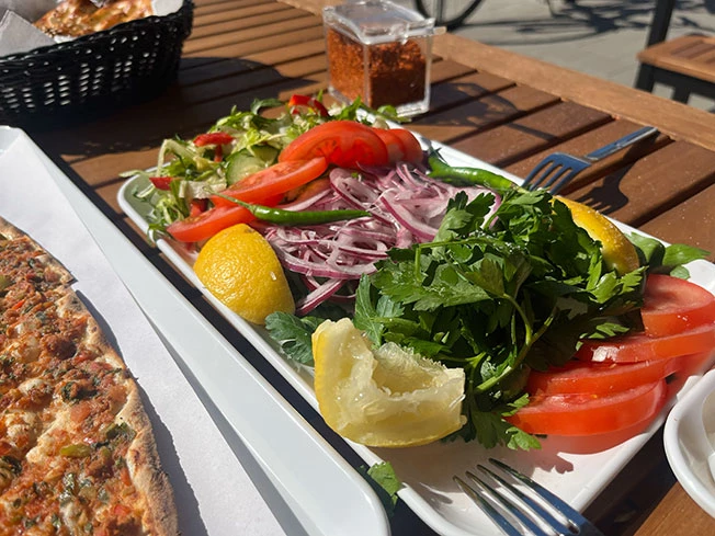 Der Chef kommt aus Hatay, und das merkst du sofort. Da steht keiner, der irgendwas nachmacht, sondern jemand, der damit aufgewachsen ist. Die Leute sagen oft, dass genau das den Unterschied macht – dieses Gefühl für Teig, Hitze und Würzung. Du nimmst das Lahmacun, packst ordentlich Petersilie rein, ein Spritzer Zitrone drüber, rollst das Ganze zusammen und dann passt alles. Mehr braucht es nicht.