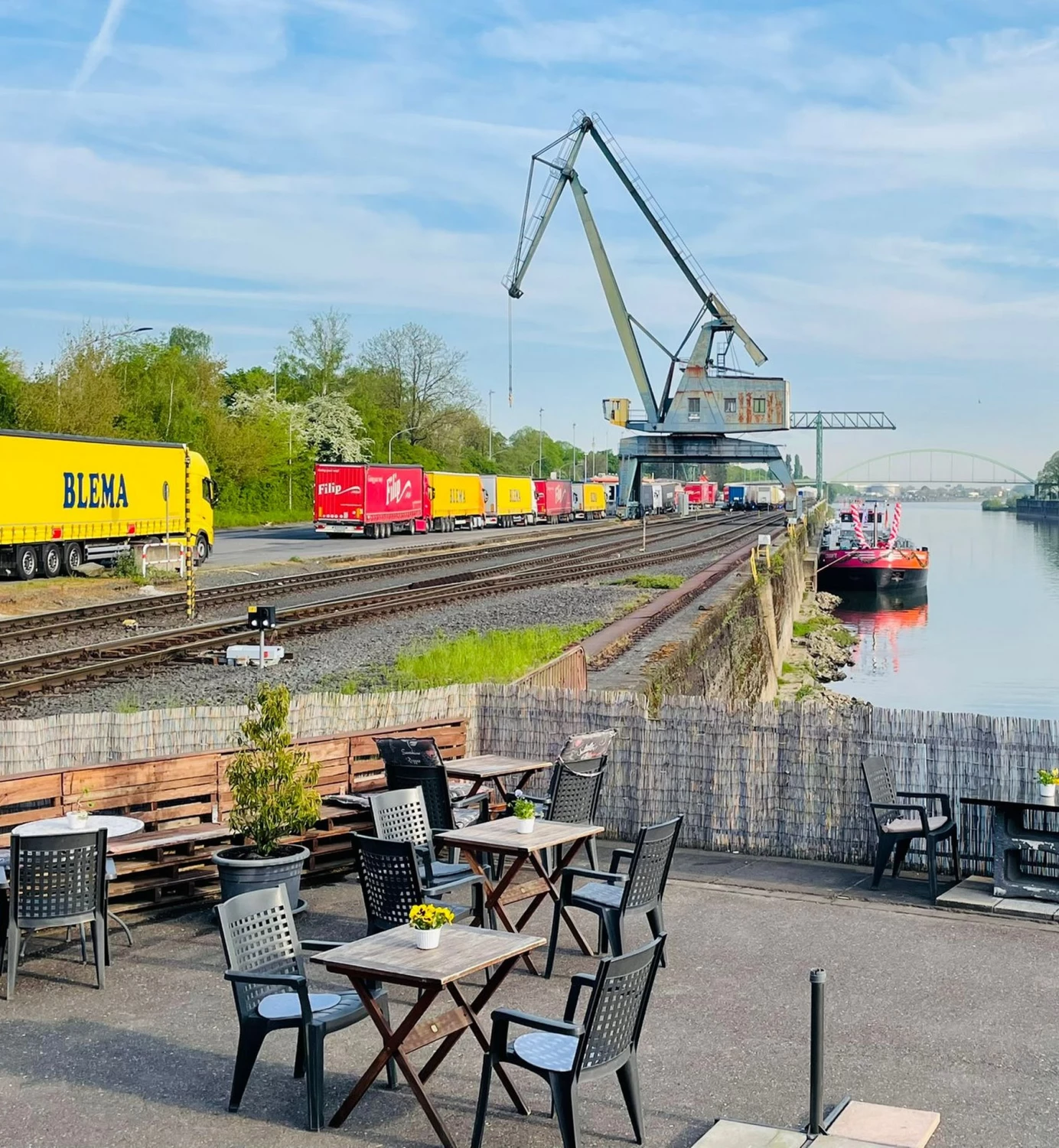 Köln hat kein Meer, aber immerhin den Niehler Hafen – und genau dort sitzt die ErKantine und macht daraus kein großes Drama. Rheinblick statt Elbe, Container statt Kräne, Kaffee statt Aperol. Wer hierherkommt, weiß: Das ist kein Ausgeh-Lokal, sondern ein Ort für den Tag. Früh geöffnet, früh belebt, früh relevant. Frühstück läuft, Mittagstisch läuft, dazwischen Gespräche, Laptops, kurze Pausen. Alles pragmatisch, alles auf Nutzung ausgelegt. Genau das macht den Laden stark.