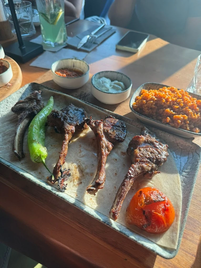 Auf der Karte steht neben dem Yaprak-Döner eine Grillküche, die in vielen Gästebewertungen für ihre Präzision gelobt wird: Lammspieß mit klarer Würzung, Hähnchen vom Rost, gemischte Platten mit saftiger Textur und stabilem Aromaprofil. Dazu kommen Vorspeisen, die weit über das Übliche hinausgehen – cremiges Baba Ganoush, gebackener Feta mit Sesam und Honig, Tzatziki mit Minze, handgefaltete Manti in Joghurt-Butter. Fischgerichte wie Dorade oder Lachsfilet sind sauber gearbeitet und passen atmosphärisch perfekt zur Lage am Wasser. Die Küche bleibt sichtbar türkisch in der Basis, wirkt aber modern, fokussiert und handwerklich sehr ordentlich umgesetzt.